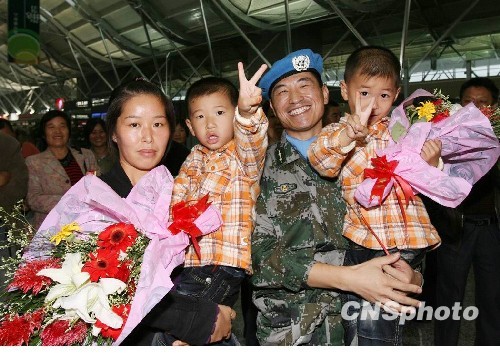 9月8日晚,济南军区某工兵团第三批赴苏丹达尔富尔维和官兵从新郑国际机场乘专机启程。维和军官李小俊的妻子及两个双胞胎儿子赶来送行,儿子兴奋地作出胜利手势,说要等着爸爸凯旋。中新社发 唐金江 摄