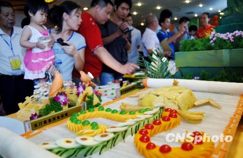 9月10日,两岸客家名厨齐聚福建龙岩切磋厨艺,编制海峡客家菜谱,打造出海峡客家美食品牌。作为在龙岩举行的第七届海峡客家旅游欢乐节的一部分,海峡客家烹饪美食大赛为欢乐节增添上味觉感受。中新社发 傅丹丹 摄