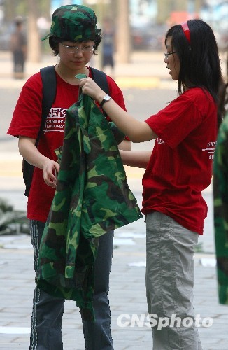 9月14日,中国人民大学新生在领取和试穿军训服装,即将开始军训。北京大部分高校新生都将于近日投入军训。这些新生大部分都出生于1990年之后,网上称这一新生代为“90后”。中新社发 苏丹 摄