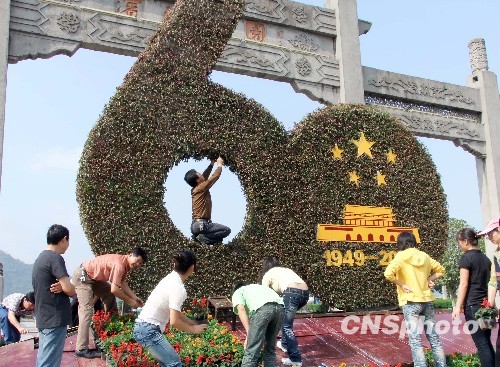 9月17日,湖北宜昌滨江公园大门迎国庆巨型扎景进入收尾。宜昌为庆祝新中国成立60周年,除摆放60万盆鲜花外,还建有许多五彩缤纷的巨型扎景,增加节日欢乐气氛。中新社发 韩玉洪 摄