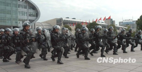为做好国庆期间安保工作,浙江义乌警方100名防暴盔甲队队员日前在该市国际商贸城二期西大门举行集结演练。图为防暴盔甲队队员正在进行动作演练。中新社发 董齐 摄