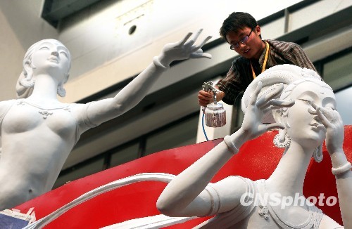 国庆节临近,工作人员在北京修饰参加国庆群众游行的甘肃省“盛世华章彩车”。中新社发 张宇 摄