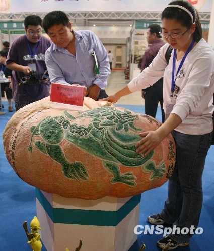 9月26日,以“绿色、科技、交易、示范”为主题的第十三届中国(廊坊)农产品交易会,在河北廊坊开发区国际会展中心举行。本届农交会交易区面积3万平米,包括优良籽种展销区、新技术、新成果展示区、农业农村节能减排技术展等9个区。图为在北戴河集发农业新品展区,一个净重495斤、价值万元人民币的超大南瓜吸引众人的目光。中新社发 翟羽佳 摄