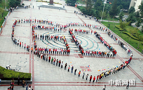 从9月28日开始,河南师范大学学生纷纷自发参加在本校图书馆前广场、用队形组成巨幅图案“60”和“心”形的活动,并同时放飞和平鸽和氢气球,以此独特方式表达拳拳学子对祖国的热爱和祝福,用最真挚的爱国、报国心向新中国60华诞献礼。(李朝栋)