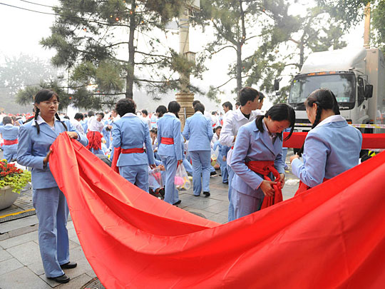 首都各界庆祝中华人民共和国成立60周年大会将于10月1日10时在北京举行。这是参加游行的群众在做准备。