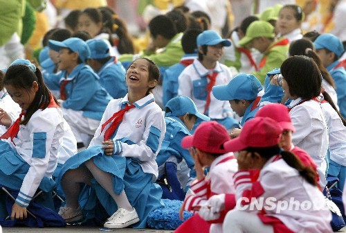 2009年10月1日,中华人民共和国成立60周年庆祝大会将在北京举行。图为等待庆典开始的孩子。中新社发 张宇 摄