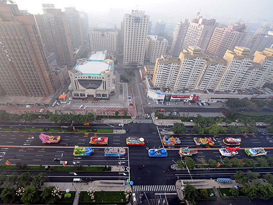 首都各界庆祝中华人民共和国成立60周年大会将于10月1日10时在北京举行。这是参加游行的彩车通过建国门外大街向长安街指定地点集结。徐亮 摄