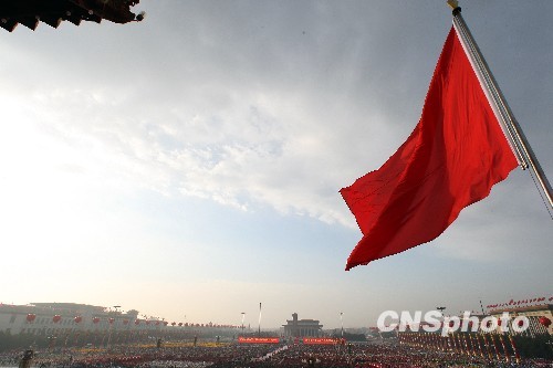 10月1日9点30分,国庆庆典前的北京雨过天晴,朝阳映照着金碧辉煌的天安门广场,“首都各界庆祝中华人民共和国成立60周年大会”定于10月1日10时在北京天安门广场举行。中新社发 任晨鸣 摄
