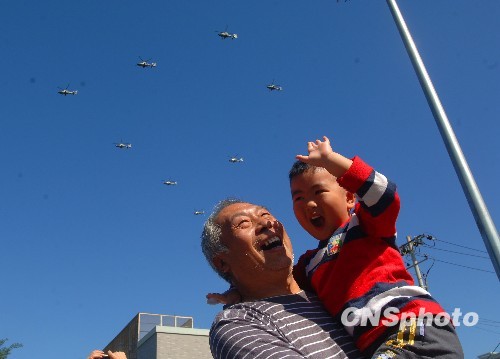 10月1日,中华人民共和国成立60周年庆祝大会在北京举行,北京市民纷纷走出家门亲睹盛况。图为街头观看直升机梯队的祖孙俩兴高采烈。中新社发 李学仕 摄