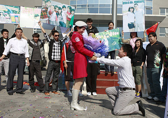 10月5日,北京,24岁的陈述含来到位于朝阳区黑庄户的阅兵村,向他5天前刚刚身着红色军礼服从天安门前受阅经过的女友田雨晨求婚。