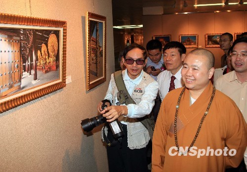 10月10日,“梵刹华粹——迎世博上海佛教建筑艺术摄影展”开幕,这是上海首次集中展示90余座对外开放的佛教寺院建筑艺术,吸引法师、佛教信徒和摄影爱好者观赏。据悉,1978年上海仅有一所寺院对外开放,如今达90余座。中新社发 潘索菲 摄