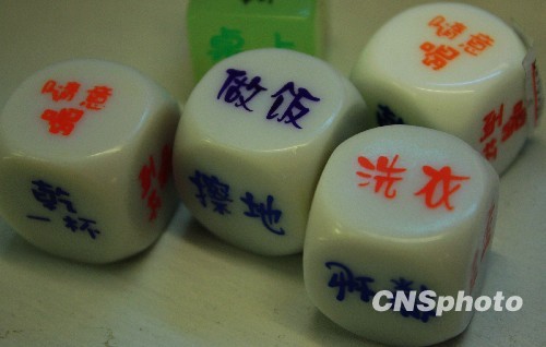 10月,家务骰子在重庆80后小夫妻中开始流行。骰子的六面分别是买菜、做饭、洗衣、洗碗、擦地、发呆。据称,买家一都是女孩子,她们在考虑如何把家务活全部转到老公手中去。图为家务骰子外形和用法均与行酒令的骰子如出一辙。中新社发 郭晋嘉 摄