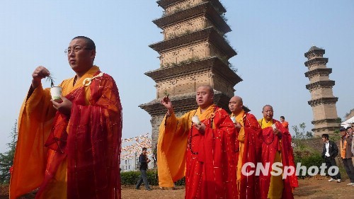 10月15日,中国佛教华严宗祖庭华严寺正式启动修复重建工程。华严寺位于西安市长安区,距市中心以南十公里,华严宗经由此传播到日本、韩国等地,在佛教史上具重要的地位。历经千百年岁月,华严寺主体建筑基本被毁,是中国佛教八大宗派祖庭寺院中,唯一尚未恢复重建的寺院。图为华严寺僧人举行洒扫仪式。中新社发 冽玮 摄
