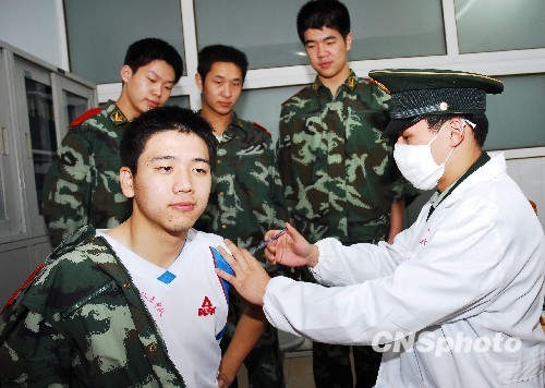 10月27日,一名军医在为执勤一线的武警官兵接种甲型H1N1流感疫苗。 当日,武警江苏省总队南京市支队为从事重点岗位、担负重要任务的750余名官兵作为重点人群,优先接种甲型疫苗。之后将根据疫苗供应量的逐步增加,分批扩大接种范围。中新社发 韩华 摄