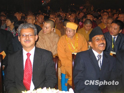 10月27日晚间,“净心慈恩、盛世长安”长安佛教学术研讨会在西安大慈恩寺开幕。 来自印度、尼泊尔等国驻华使节、中国名山名寺的著名高僧大德及佛教研究方面专家学者等三百余人参加。图为尼泊尔驻华大使坦卡·普拉萨德·卡尔基(前排右)、印度驻华公使杰迪布·马宗达在开幕式上。中新社发 冽玮 摄