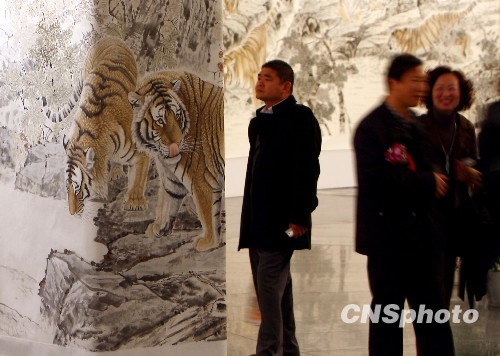 11月1日,历时12年创作完成的百虎百米长卷在北京中华世界坛与公众见面。为唤起人类对濒危物种的保护意识,迎接虎年的到来,王焕富、郑淑萍二人从上个虎年开始,用12年的时间,创作完成这幅巨作。画作长128米、高2.4米,画中109只东北虎形态各异、背景以长白山原始森林作衬,表现东北虎在四季中不同的生活习性,体现了中国工笔画纤毫毕现的艺术效果,另人身临其境。中新社发 杜洋 摄