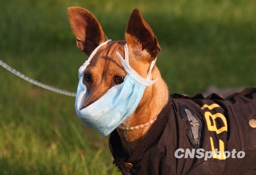 2009年11月5日,湖北恩施,一宠物狗被主人戴上口罩,在大街上溜达,吸引了众人。主人说,由于天气转冷、最近甲流流行,她便想到了给自己的狗狗穿衣保暖,戴上自制的口罩防御甲流。中新社发 南骏 摄