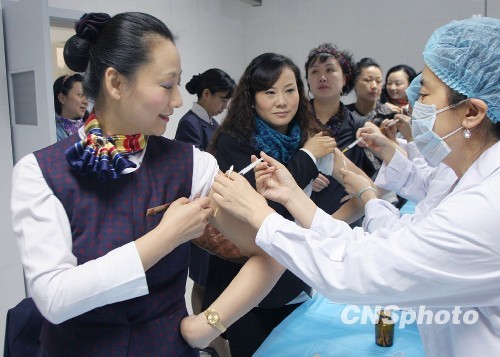 11月11日,中国国航西南分公司乘务长卢悦(左)在成都双流机场医救中心接种点进行甲流疫苗接种注射。当日,国航西南分公司包括飞行员、空乘、地面服务员等331人完成了疫苗接种,成都民航单位正式启动了生产一线岗位人员甲流疫苗接种工作。中新社发 易世忠 摄