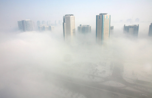2009年11月13日,河南遭受自有气象记录以来最大暴雪,暴雪后河南郑州出现大雾,市区建筑在雾中若隐若现犹如“海市蜃楼”,人间仙境,高楼在雾海中穿梭,景色美不胜收。陈晓东 摄