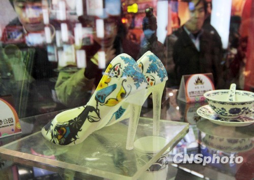 11月27日,一双用巧克力制作的高跟鞋亮相北京国际文化创意博览会,吸引许多观众驻族观看。同时展示还有巧克力的青花瓷和兵马俑。据悉,国内首个巧克力主题的梦幻公园将在明年1月份落户北京“鸟巢”北侧广场。中新社发 吴芒子 摄