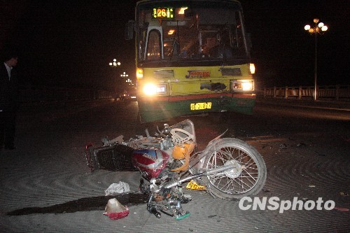 11月30日晚上8时许,广西梧州市莲花桥中段,一辆摩托车与巴士发生严重对撞,导致摩托车司机被撞抛至巴士的挡风玻璃上,随后被反弹出5、6米外。司机在被送往医院后不治身亡。中新社发 覃自明 摄