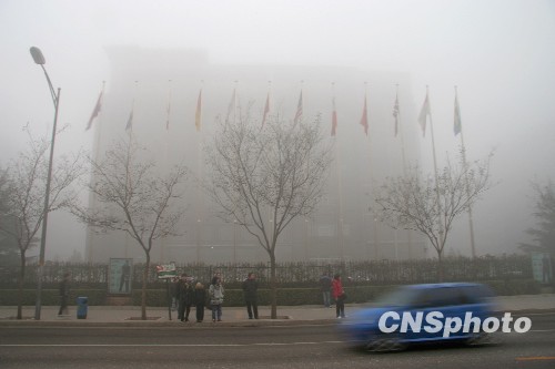 12月2日清晨,一场大雾笼罩北京,公路能见度低,人们出行受到一定影响。中新社发 余明 摄