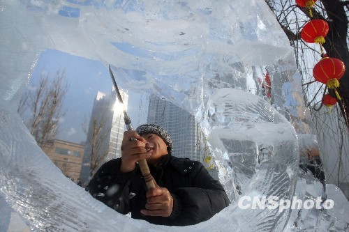12月9日,黑龙江哈尔滨市区内,工匠们正在对冰雕做最后的雕琢。该市街道利用天然优势,雕琢十余处冰景,配以大红灯笼营造出浓厚岁末迎新气氛。中新社发 靖阳 摄