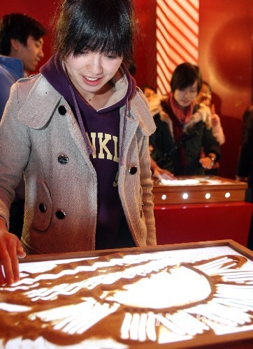 随着工作和生活压力的不断增加,越来越多的上海白领在平时寻求着各种各样的方式为自己减压。12月10日,在上海大宁国际广场举行的“沙画”表演,吸引了众多白领的目光,不少人还亲自上阵学画沙画。中新社发 汤彦俊 摄