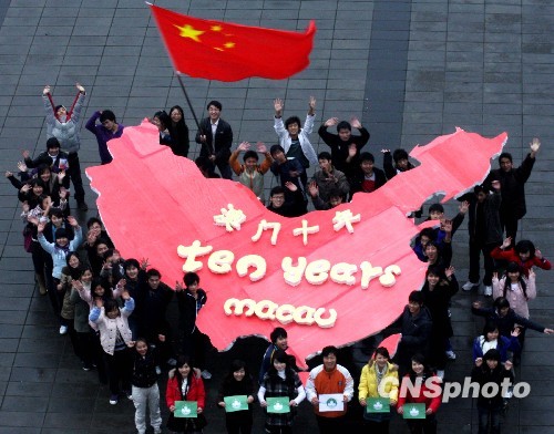 12月19日,重庆科创职业学院的大学生们精心制作了一幅巨大的中国版图,并在版图上写了中英文的“澳门十年”,表达对澳门回归祖国十周年的喜悦心情。中新社发 陈仕川 摄