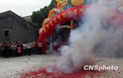 12月20日,在澳门特别行政区新任行政长官崔世安的故乡——广东江门崔嘉亨村,乡亲们与来自国内各地的崔氏同宗欢聚在崔氏祠堂前,燃起炮竹,表示庆祝。中新社发 梁永强 摄