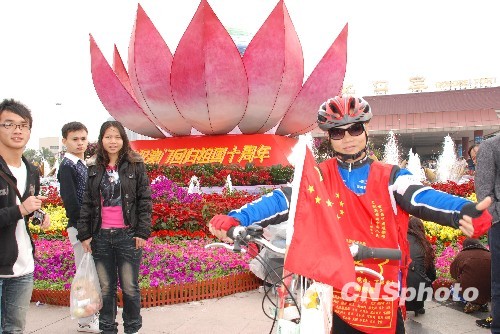 12月20日,为庆贺澳门回归十周年,“自行车环球慈善游”的赖立坤专程骑车到拱北口岸请游客签名,并与游客合影。赖立坤11月28日从广东顺德出发,12月14日到香港,16日和17日途径澳门,在澳门受到了市民的欢迎和支持。赖立坤计划由西向东环绕地球穿行48个国家和地区,全程将历时五年,环游经费靠资助完成,同时他把获得的资金捐赠给慈善机构,他说此行的目的除了慈善,也为了表现中国人的勇气、毅力和信仰。中新社发 宁运喜 摄