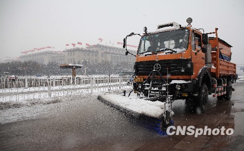 1月3日,北京环卫部门的除雪车在街头喷洒融雪剂。当日,北京普降大雪。相关部门启动除雪应急预案,方便市民和游客出行。 中新社发 陈晓根 摄