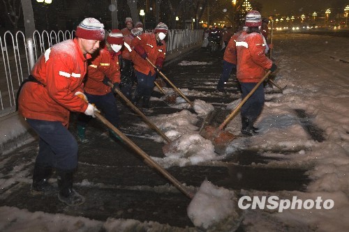 2010年1月3日晚,大雪过后,为了市民出行便利,首都环卫工人们冒着零下十五六度的严寒,清扫街道上的积雪。中新社发 刘小丁 摄