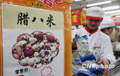 2010年1月4日,北京某食品集团安定门营业部的工作人员将“腊八米”摆上柜台。中国传统历的“腊八”将至,商家提前将“腊八米”摆上柜台,抢夺消费商机。中新社发 老罗 摄