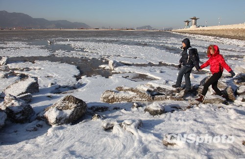 1月13日,江苏省连云港市最低温度达到零下11摄氏度,刷新入冬以来气温最低纪录。低温天气造出了沿海独特的生态景观。海上持续的偏北大风致使海岸边出现了近年来罕见的数万平方米海水冰凌。大片的海水冰凌如同皑皑白雪,在阳光的照射下晶莹剔透,成为冬季海滨一道独特的生态风景线。中新社发 王健民 摄