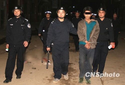 1月19日,广西贺州市警方动用100多名警员,在凌晨3时进村抓捕涉嫌用土枪土炮聚众斗殴的案犯。广西贺州市警方介绍,2009年8月12日,贺州市平桂管理区公会镇联合村因矿山等纠纷,发生了一起用土枪土炮聚众斗殴的恶性案件,致7人受伤。在当天凌晨的抓捕行动中,共抓获谢某辉、谢某万等10名犯罪嫌疑人。中新社发 赖锦才 摄