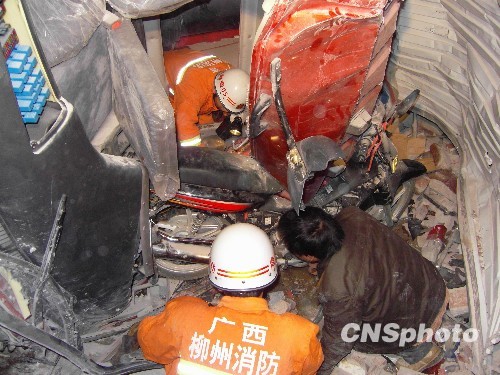 2月3日晚9时许,广西柳州市鹿寨县一辆拉铁矿的大货车侧翻后撞入路旁的一店铺内,所幸店中无人,事故造成货车司机受伤被困。柳州鹿寨消防中队接警后到场剪断方向盘,将司机成功救出。中新社发 李建明 摄