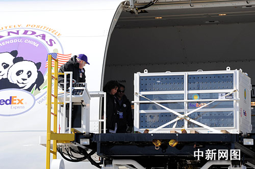 大熊猫“泰山”4日在华盛顿杜勒斯机场登上回国的飞机,联邦快递工作人员全程小心翼翼。李静 摄