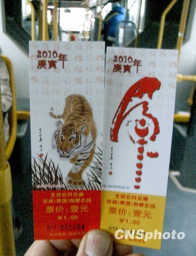 2月6日日,是农历腊月二十三,民间俗称小年。为迎接2010年庚寅虎年新春佳节的到来,恭祝我们新春快乐,北京公交集团发售2010年虎年生肖纪念车票一套——第二套生肖纪念车票。首班车开始,公交集团在所属有人售票线路车上发售虎年生肖普通纪念车票,乘客上车即可购买。 据悉,本次发售的虎年生肖普通纪念车票一套共2张,均为著名书法家有关虎的书画作品。中新社发 李文明 摄