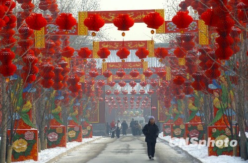 2月8日,2010年第25届地坛春节庙会场地布置一新,喜气洋洋迎接虎年庙会。往年地坛庙会游人均超过百万人次,去年达到120万人次,仅庙会门票就是一大收入,加上四季书市的收入,地坛成为北京经济效益最好的园林部门之一。中新社发 邹宪 摄