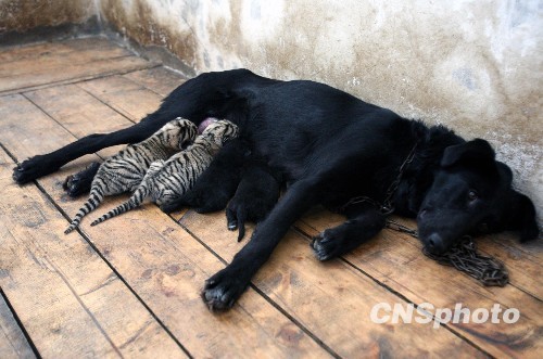 2月9日,新疆天山野生动物园一只奶水充足的德国黑贝“黑子”正在给两只出生不久的小老虎喂奶。据饲养员介绍,两只小老虎一雄一雌,出生后被母虎遗弃,动物院通过当地媒体顺利为两只小老虎找到了适合替代的母乳,一只产崽不久且奶水充足的德国黑贝“黑子”为两只小老虎充当“奶妈”,而“黑子”也不负众望,将两只小老虎当成自己的狗仔来喂养。中新社发 刘新 摄