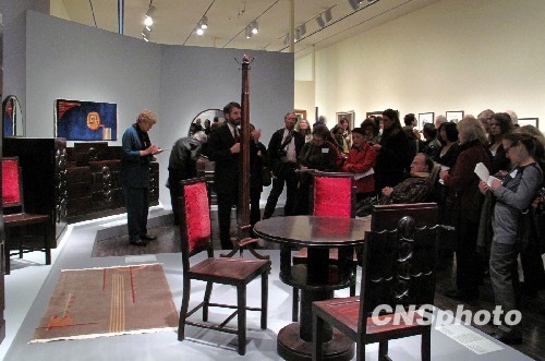 当地时间2月10日,130多件代表上海百年历史的艺术作品在美国旧金山亚洲艺术博物馆揭幕。展品体现了东方与西方、古典与现代、传统与科技在上海的完美结合,是以上海为主题的艺术品在世界的首次展出。图为私人收藏的40-50年代西式红木家具系列。中新社发 刘丹 摄
