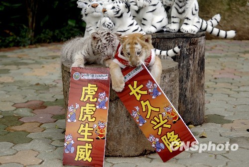 2月11日,离虎年新春还有数天,新春主角已按耐不住要提前给市民拜年。香江野生动物世界俩幼虎——白虎和金虎身着喜庆棉袄,“爪”住晖春向广大市民拜早年。中新社发 刘卫勇 摄