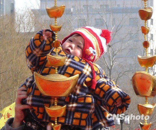 2010年2月18日,小朋友在莲花池庙会上摸“金元宝”。春节期间,北京市民纷纷前往各大公园,赶赴庙会,欢度春节。 中新社发 玉龙 摄