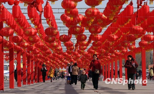 2010年2月19日,北京国际雕塑园内张灯结彩,喜气洋洋,在此举行的新春庙会吸引着各地游人前来体味“年俗”。中新社发 风生 摄