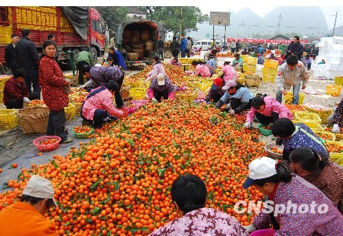 近年来,广西阳朔县积极引导各乡镇大种品牌水果,普益、高田和金宝等乡镇大力发展砂糖桔种植业,其中普益乡最为突出,仅该乡古乐村砂糖桔种植面积就达1700多亩。自去冬今春以来,砂糖桔价格一直往上涨,目前正以6元每公斤的价格热销全国各地,其价格同比上涨了70%,创下近10年最好价格。图为普益乡古乐村民正在挑选砂糖桔的热闹场面。中新社发 贺振敏 摄