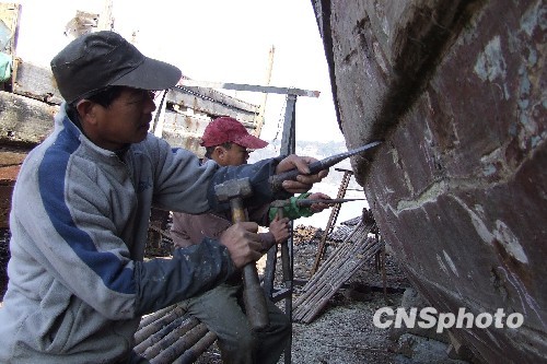 2月21日,浙江省玉环县栈台船舶修造厂的工人正在给木质船舶加固检修,据悉,为使渔船尽快投入到渔业生产中,工人们正月初四就开始上班了。 中新社发 吴达夫 摄