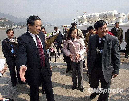 2月24日,马祖新任县长杨绥生(右一)一行15人经“两马”航线抵达福州马尾,参加当晚亮灯的“第八届两马同春闹元霄”活动,这是他2009年12月5日当选马祖县长后首次到福州。中新社发 张丽君 摄