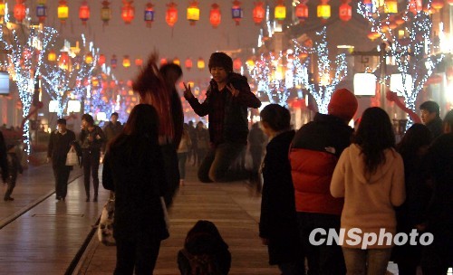 2010北京正月十五元宵节灯会近日陆续开场。图为2月24日晚,北京前门大街市集及前门上元灯会吸引了众多年轻人前往游玩。中新社发 邹宪 摄