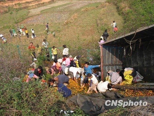 2月26日早晨,广西南宁至梧州高速路横县路段,一辆满载柑橘的大货车不慎翻下斜坡,引来附近的老少村民翻越隔离网哄抢水果。中新社发 王刚 摄